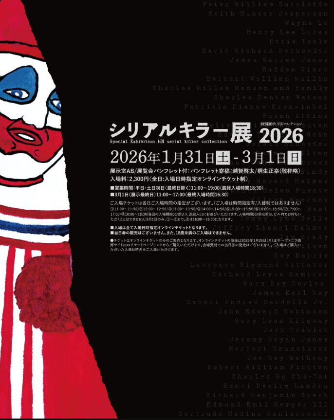 「シリアルキラー展 2026」は18歳未満入場不可で、日時指定のオンラインチケット制となっている。当日券は基本的に用意されないため、事前予約は必須だ。