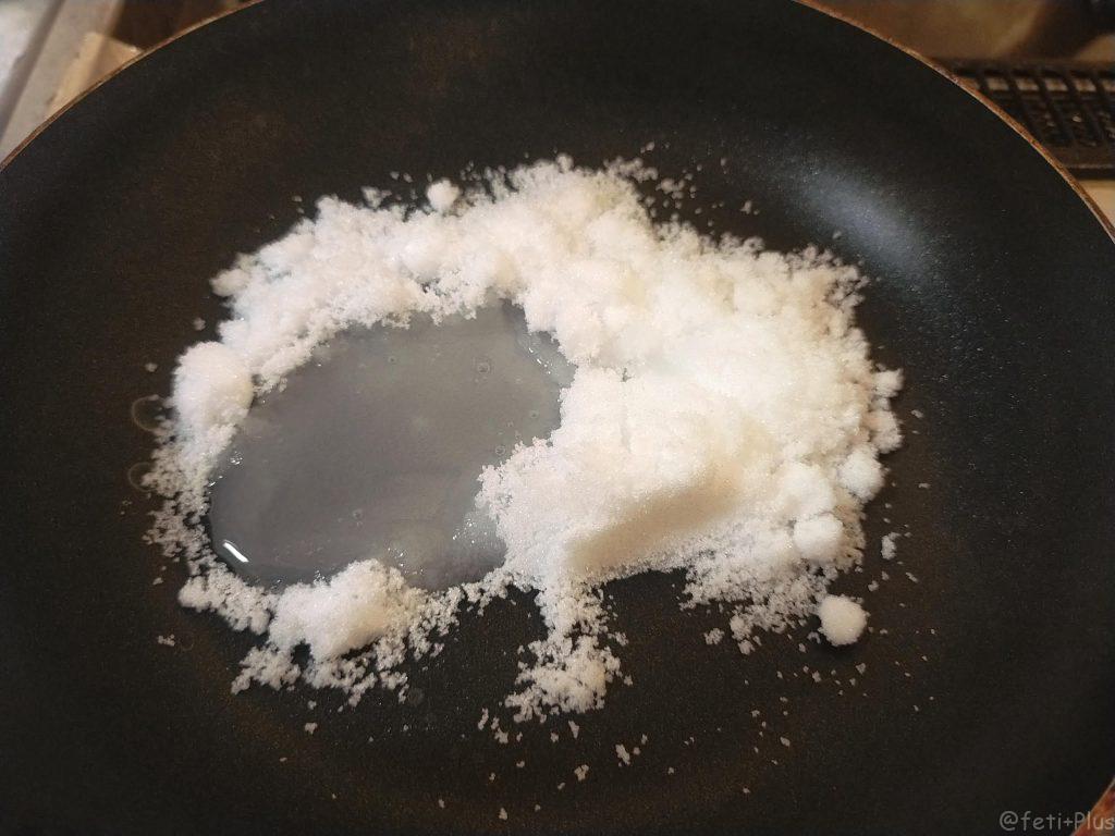フライパンに砂糖を広げ、水を大さじ1ぐらいかけて、中火で加熱すると、どんどん砂糖が溶けて液体になっていきます。
