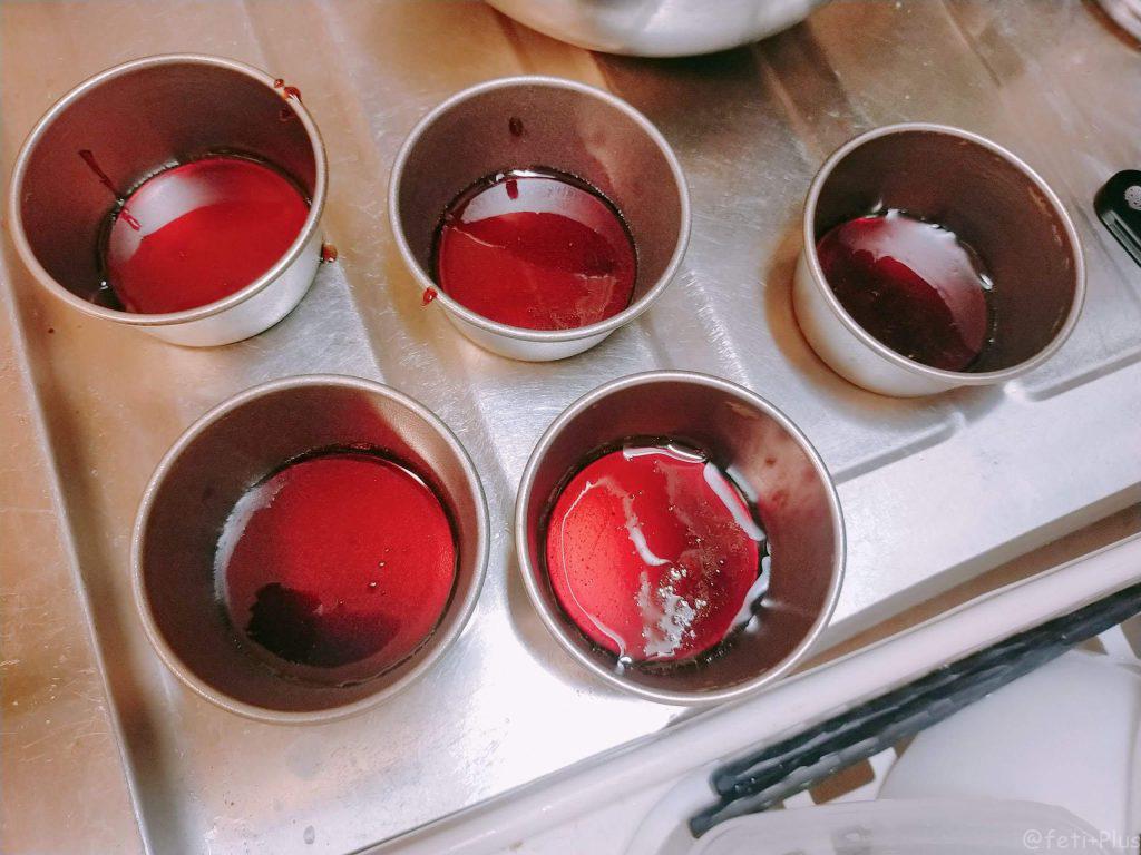 プリンカップに先程作ったカラメルソースを入れ、冷まして固くなった後にプリンの種を流し込みます。
