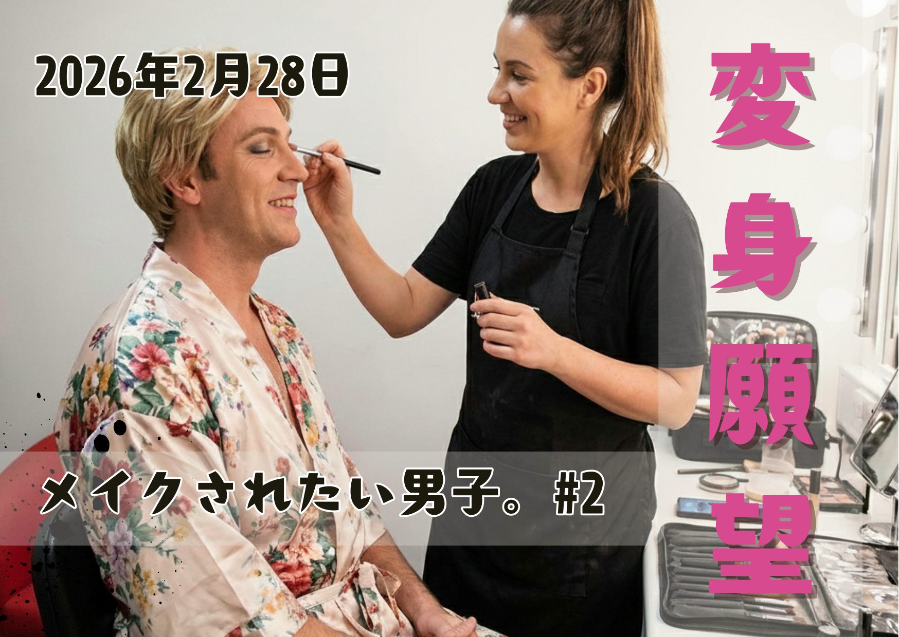 2026/2/28に「変身願望 × メイクされたい男子。#2」を開催します。会場は撮影もできる、かわいいスタジオ。