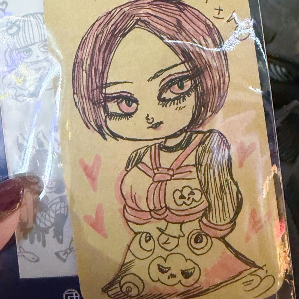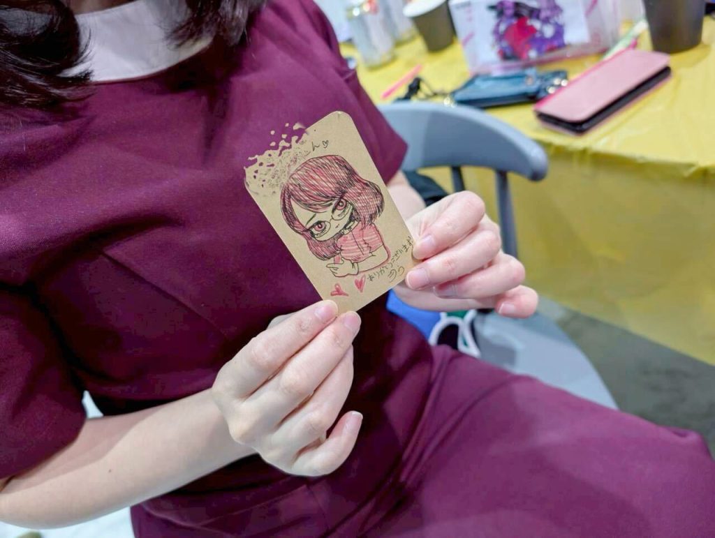 フィストフェチのお姉さまはハロウィン風ナース服で登場し、ゴム手袋を装着して存在感抜群。スタッフのシウさんの似顔絵体験を受けていて、似顔絵の完成度の高さに会場もほっこり。ちゃっかり筆者も描いてもらっちゃいました。