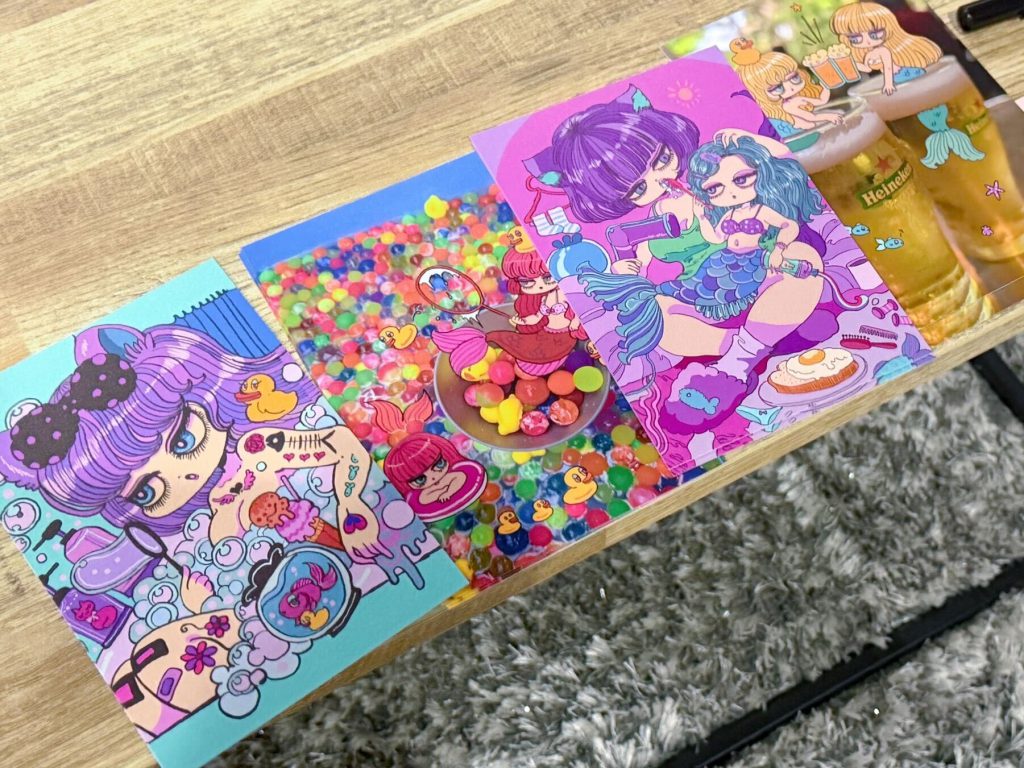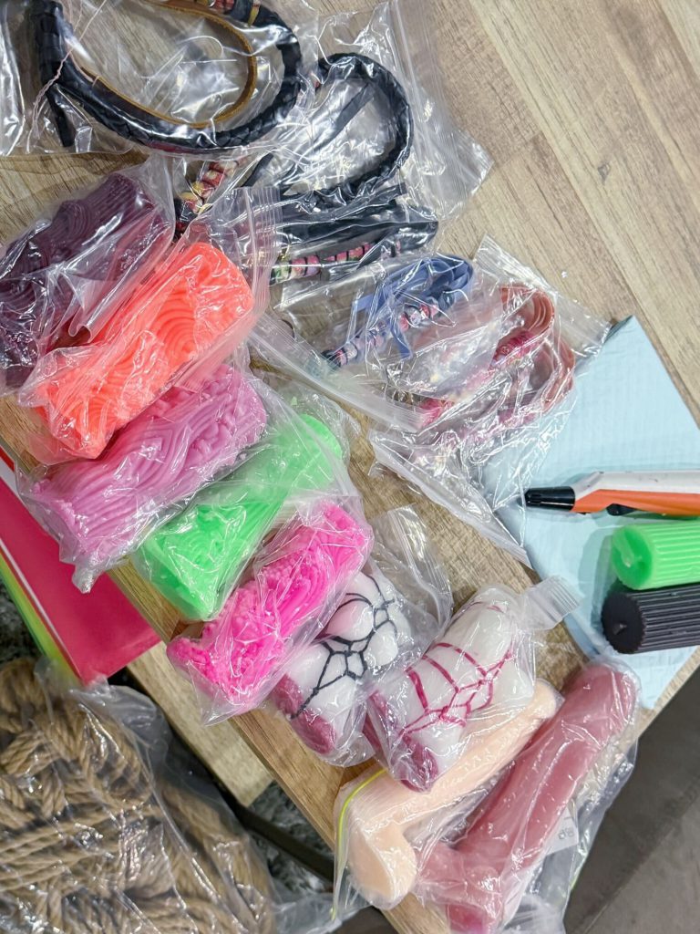 会場にはフェチグッズも多数並び、テーブルは商品でぎっしり。フェチプラスからも少しだけ出品され、蝋燭、鞭、パドル、ポストカード、アパレルなどが揃いました。鞭やパドルを見ると「こうした方がもっと痛そうだよね」と、違った使用方法にチャレンジする猛者もいて、自由で実験的な雰囲気が印象的でした。