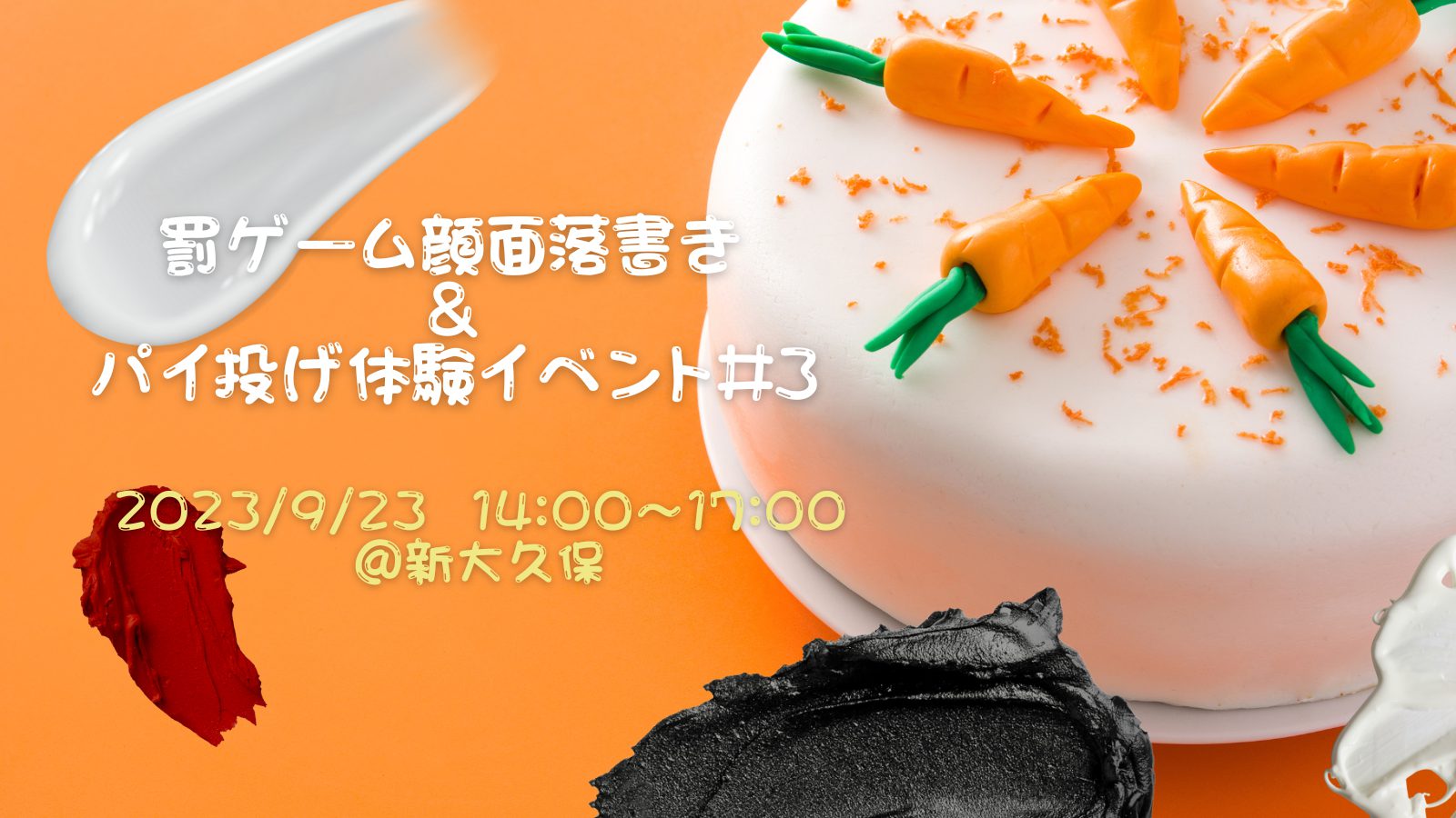 先行して参加申し込みを受け付けていた「罰ゲーム顔面落書き&パイ投げ体験イベント#3」ですが、いったん募集を締め切りましたが、重複してお申し込みしている方が何名かいらっしゃるようなので、あと数名再募集いたします。