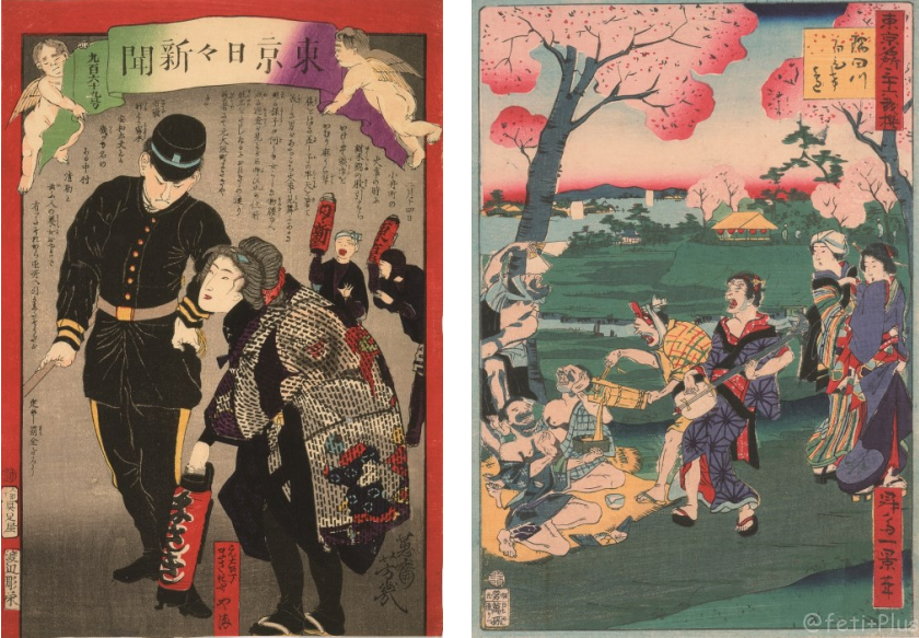 右:⑨昇斎一景《東京名所三十六戯撰 隅田川白ひげ辺》 明治5