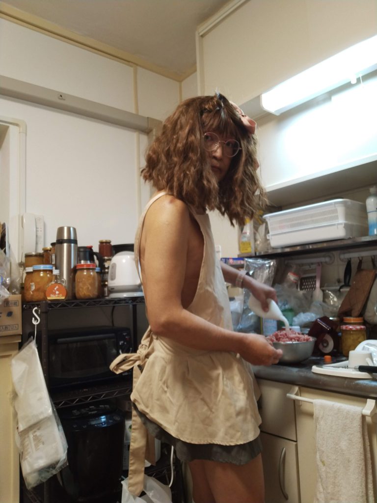 今回も裸エプロンなのですが、このエプロンだと隠す範囲が広くてあんまりエロくありません。