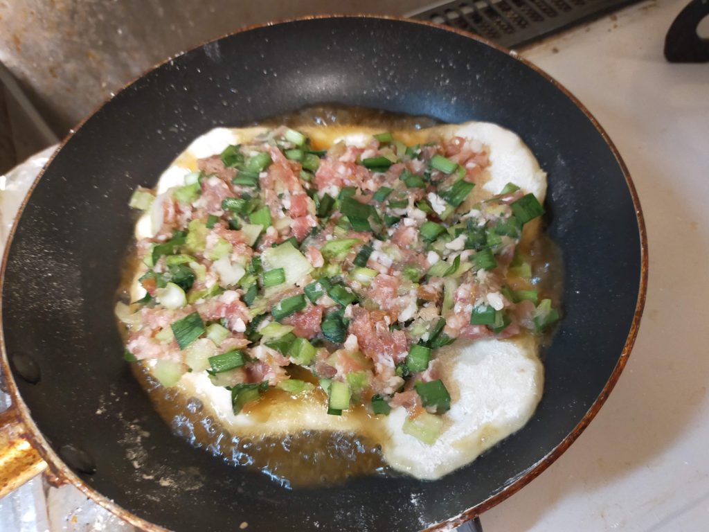 フライパンに胡麻油を引いて、皮を置き、上に餃子の餡を乗せてから、更に上に皮を置いて両面を焼きます。上の皮を置いたときにすぐ上の皮と下の皮をくっつけないと、焼き上がりでばらばらになってしまいます。