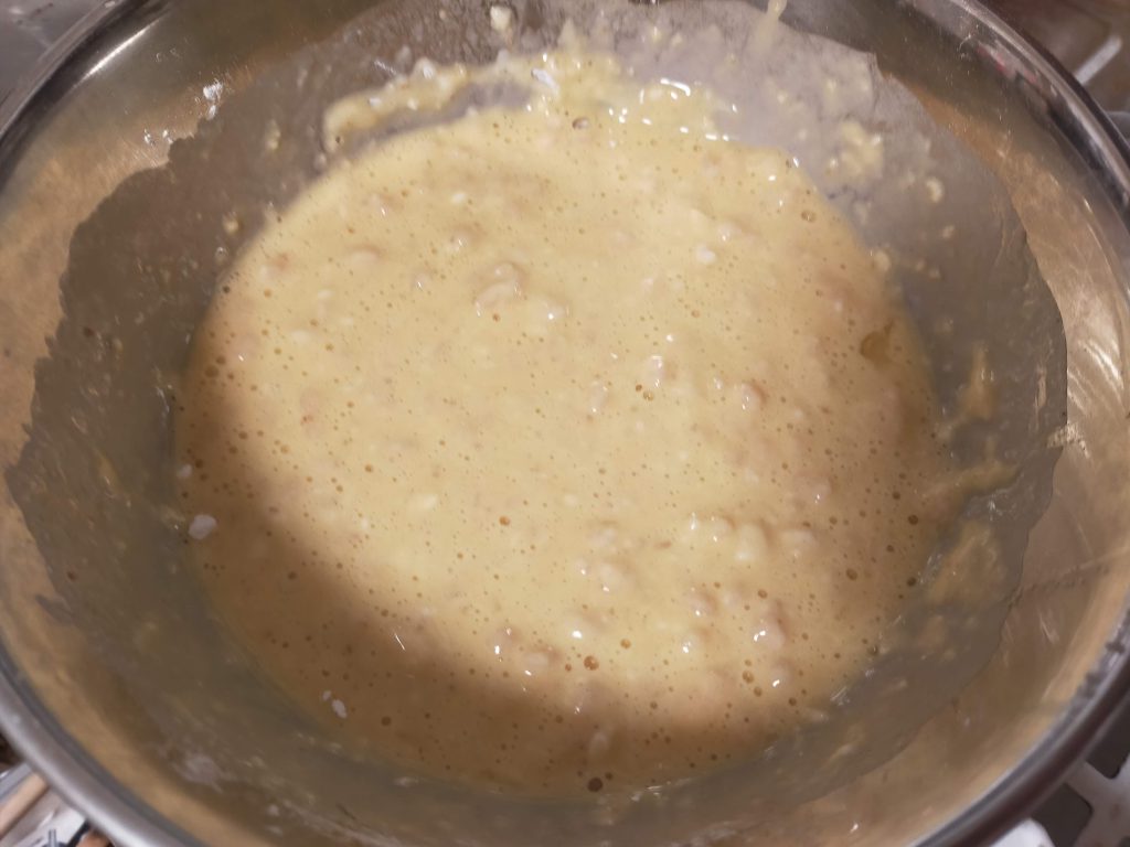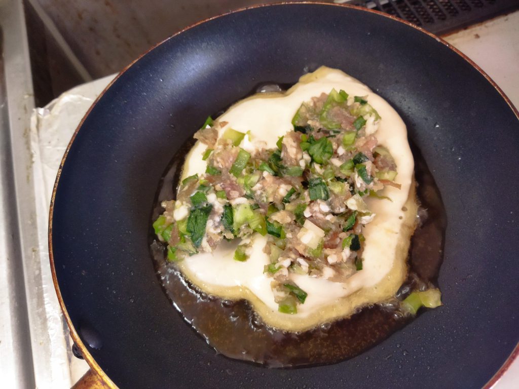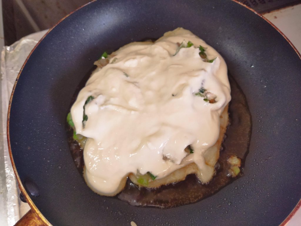 下の皮の材料と餡を乗せた後、上の皮の材料になる小麦粉を流します。お好み焼きのように卵を入れても良いと思いますが、この時は小麦粉を溶いただけです。