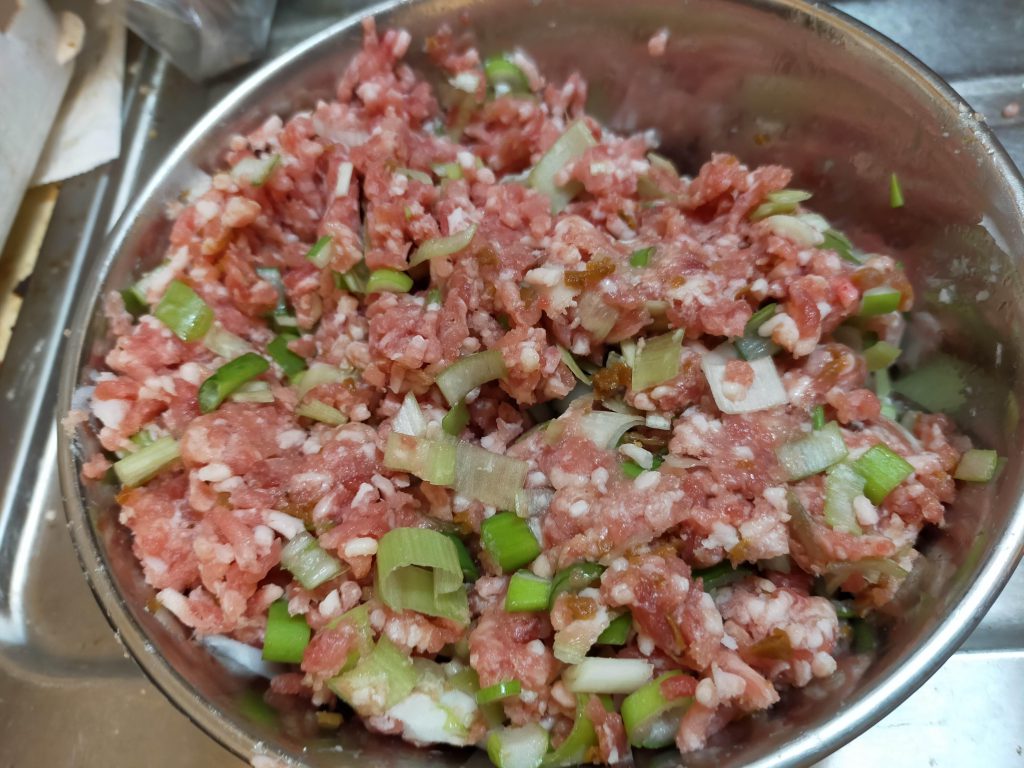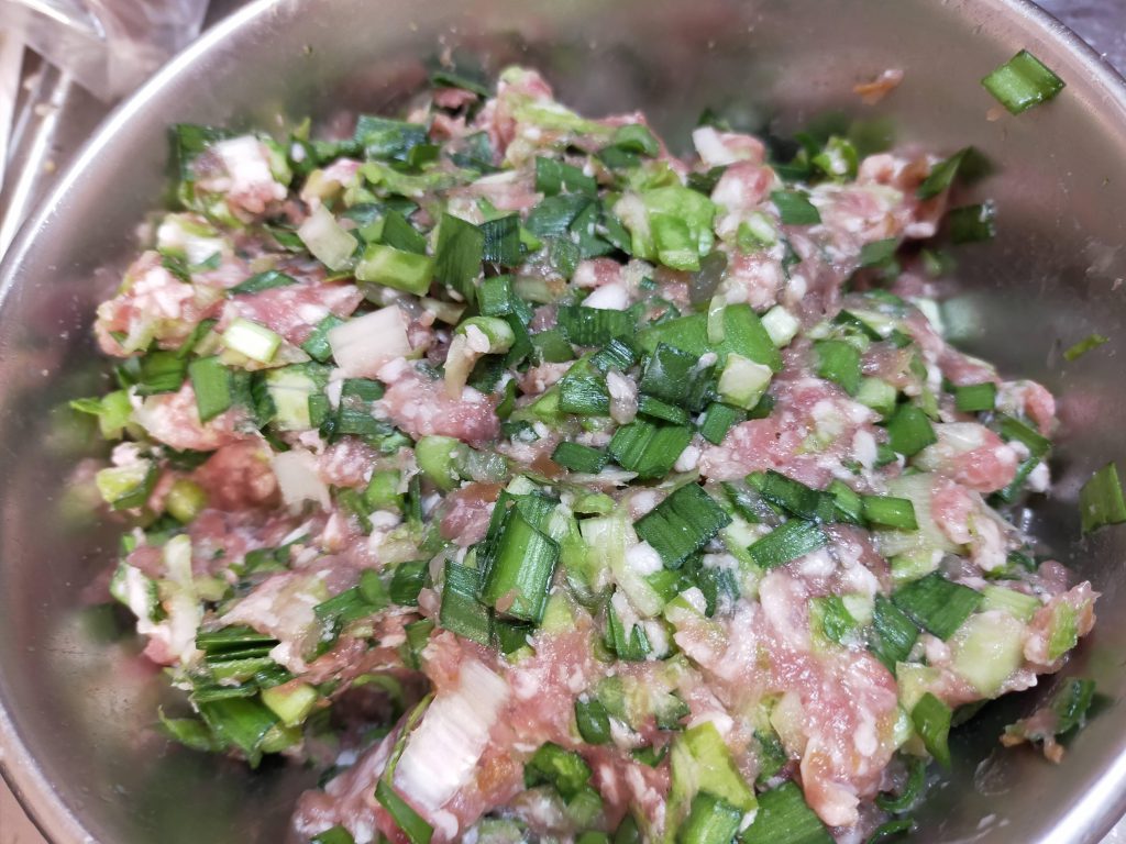 餡は、豚ひき肉とネギのみじん切り、ニラのみじん切りを入れて塩を一振りしてからよく混ぜるというごく普通の作り方です。うちの場合、にんにくは入れませんが、好みでチューブタイプのおろしニンニクを入れても良いと思います。
