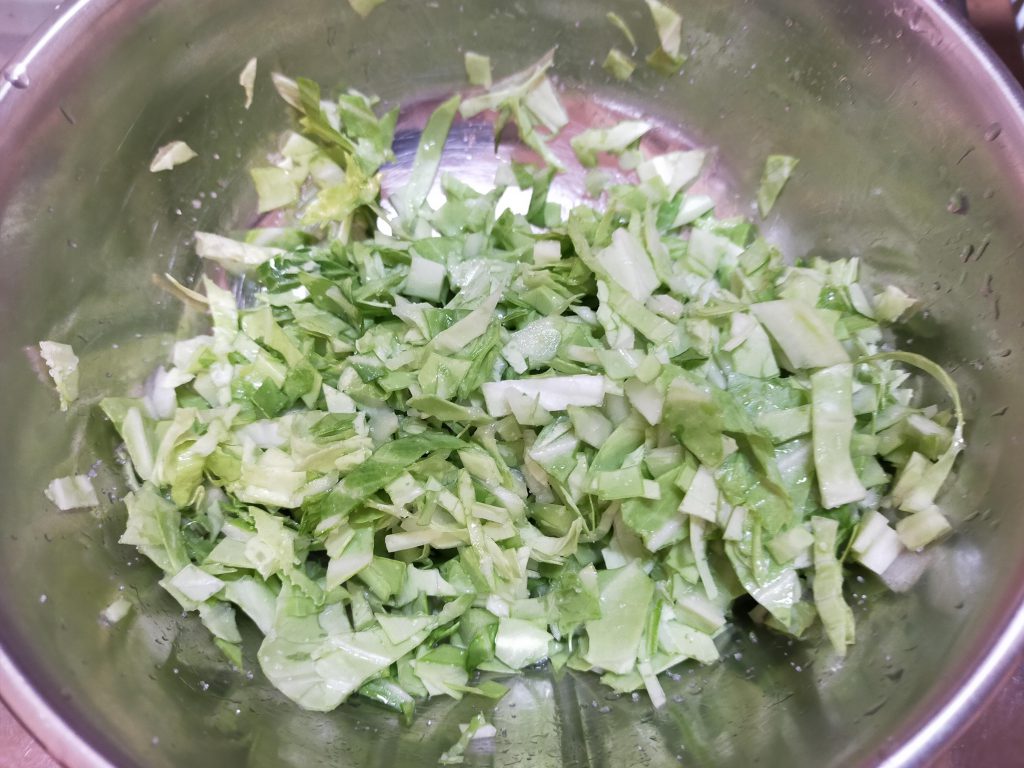 キャベツはみじん切りにしてから塩をひとつまみ振って、よく揉んで水分を切ってから全体を良く混ぜます。これで餡の完成です。
