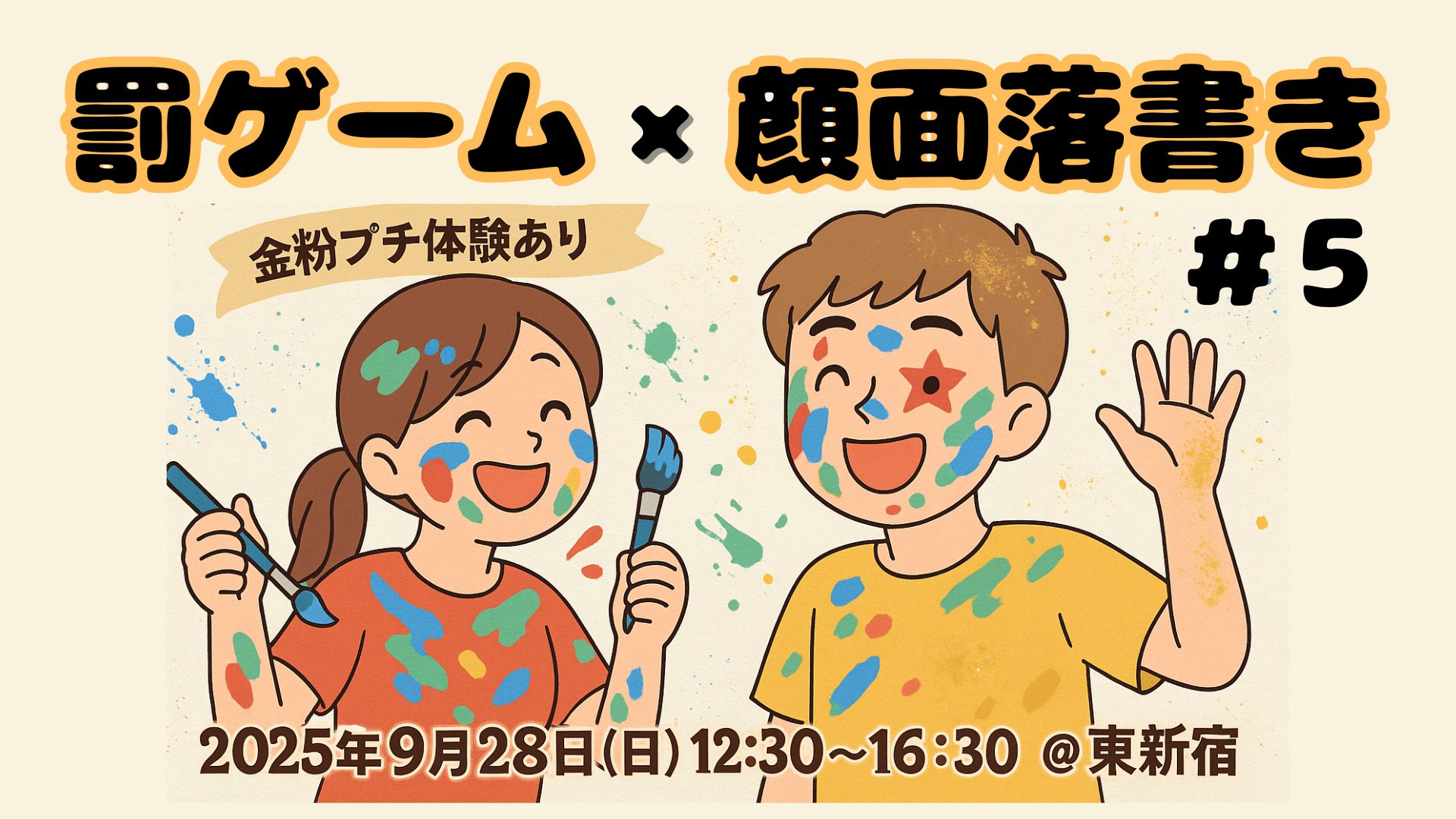 フェチ好きが集まる人気イベント、フェチプラス主催の「第5回罰ゲーム×顔面落書きイベント&金粉プチ体験」が、2025年9月28日(日)に東新宿で開催されます!