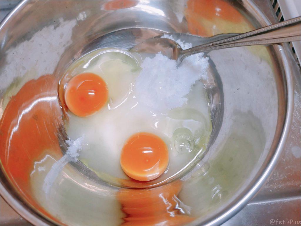 まず、ボールに卵2個を入れて砂糖と一緒に泡立て器でよく混ぜます。