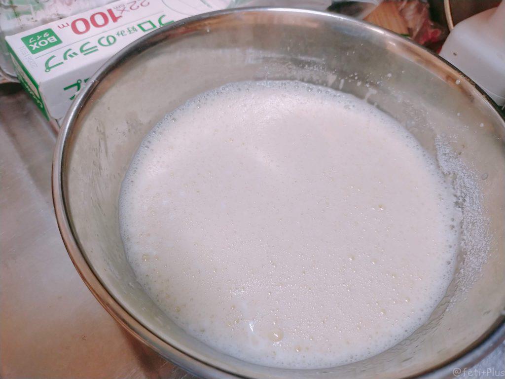 温めた牛乳を卵と砂糖を混ぜたボールに少しづつ入れて、全体が均一になるように泡立て器で泡立たないようにゆっくりと混ぜます。
