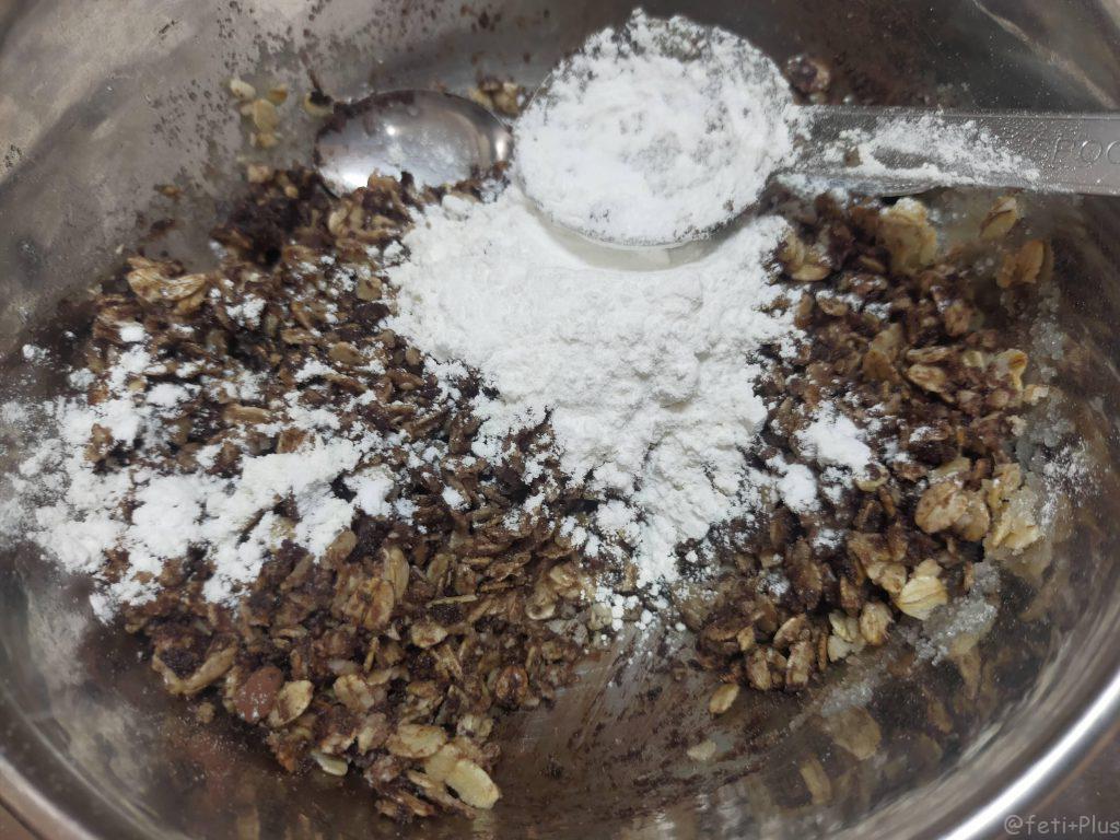 まず、種を作ります。オートミールと砂糖をまんべんなく混ぜ、更にオリーブ油を加えてよく混ぜます。