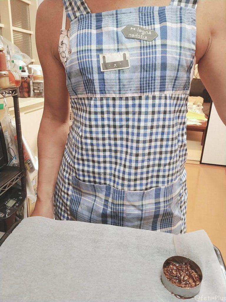 今回は裸エプロンで失礼します。焼き終わったら、オーブンを開けて、冷めれば完成です。