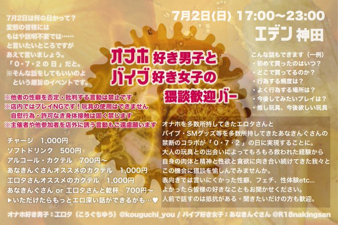 7月2日は、みんな大好きオ〇ニーの日!ということで、2023年7月2日エデン神田にて「オナホ好き男子とバイブ好き女子の猥談歓迎バー」がオープンします!