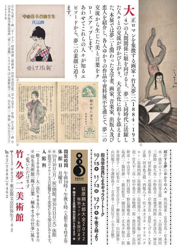 2022年10月1日より、東京大学弥生門前にある「竹久夢二美術館」にて、「夢二をとりまく人間関係ー交流から生まれた美と言の葉ー」が開催されます。