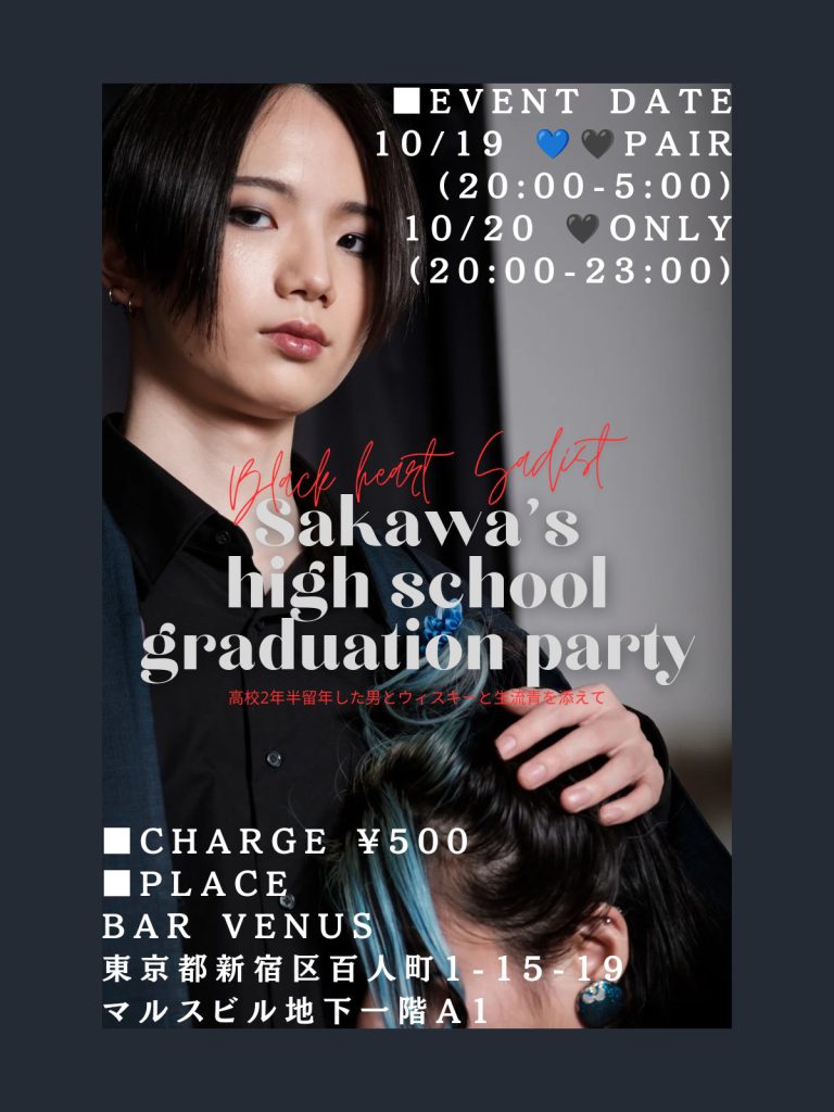 | イベントタイトル | Sakawa’s high school graduation party 高校2年半留年した男とウィスキーと生流青を添えて |