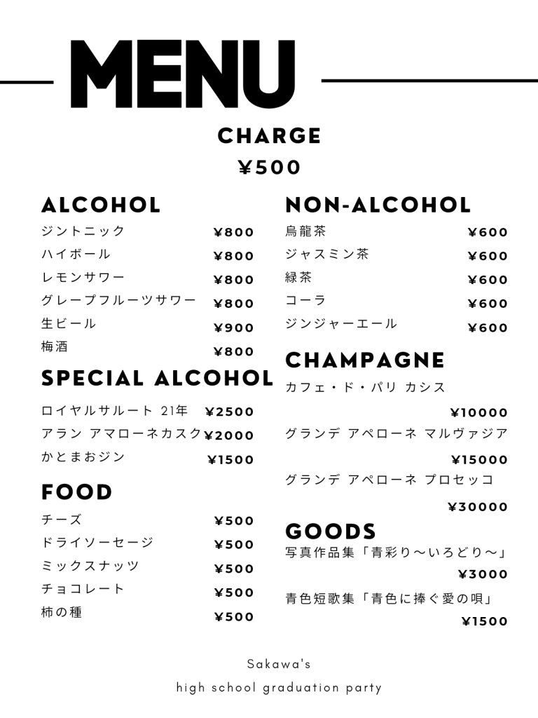 1日店長企画のタイトルは、その名も、「Sakawa’s high school graduation party 高校2年半留年した男とウィスキーと生流青を添えて」