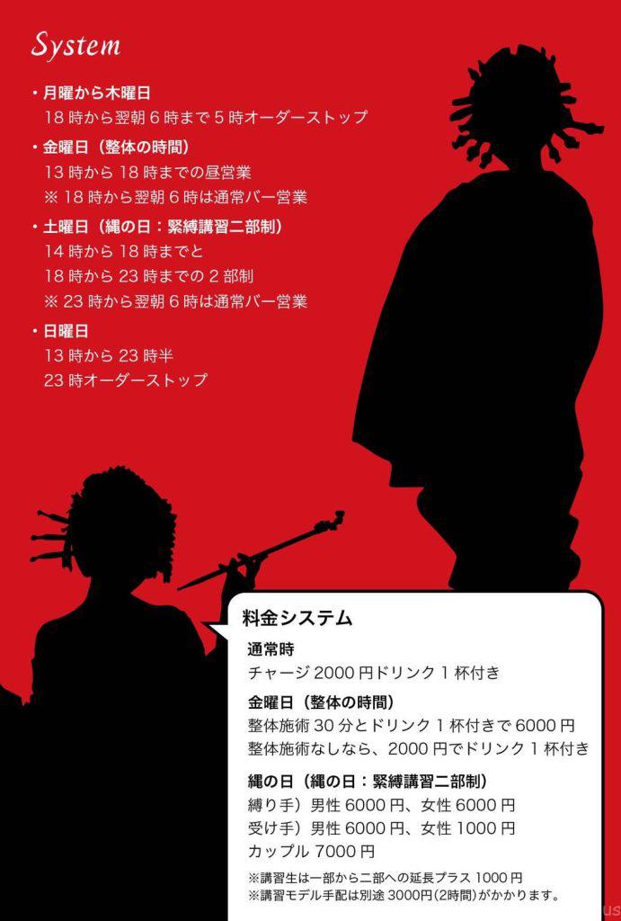 なにやら曜日によってお店を担当される方が違うようです。12月1日にはオープニングイベントとして、プロマジシャン レフティ平田さんによるマジックショー&縄講師をつとめる方の緊縛ショーが催されます。緊縛ショーはなんとなくわかるけど、マジック??ちょっとエッチな感じなのでしょうか??気になりますね。