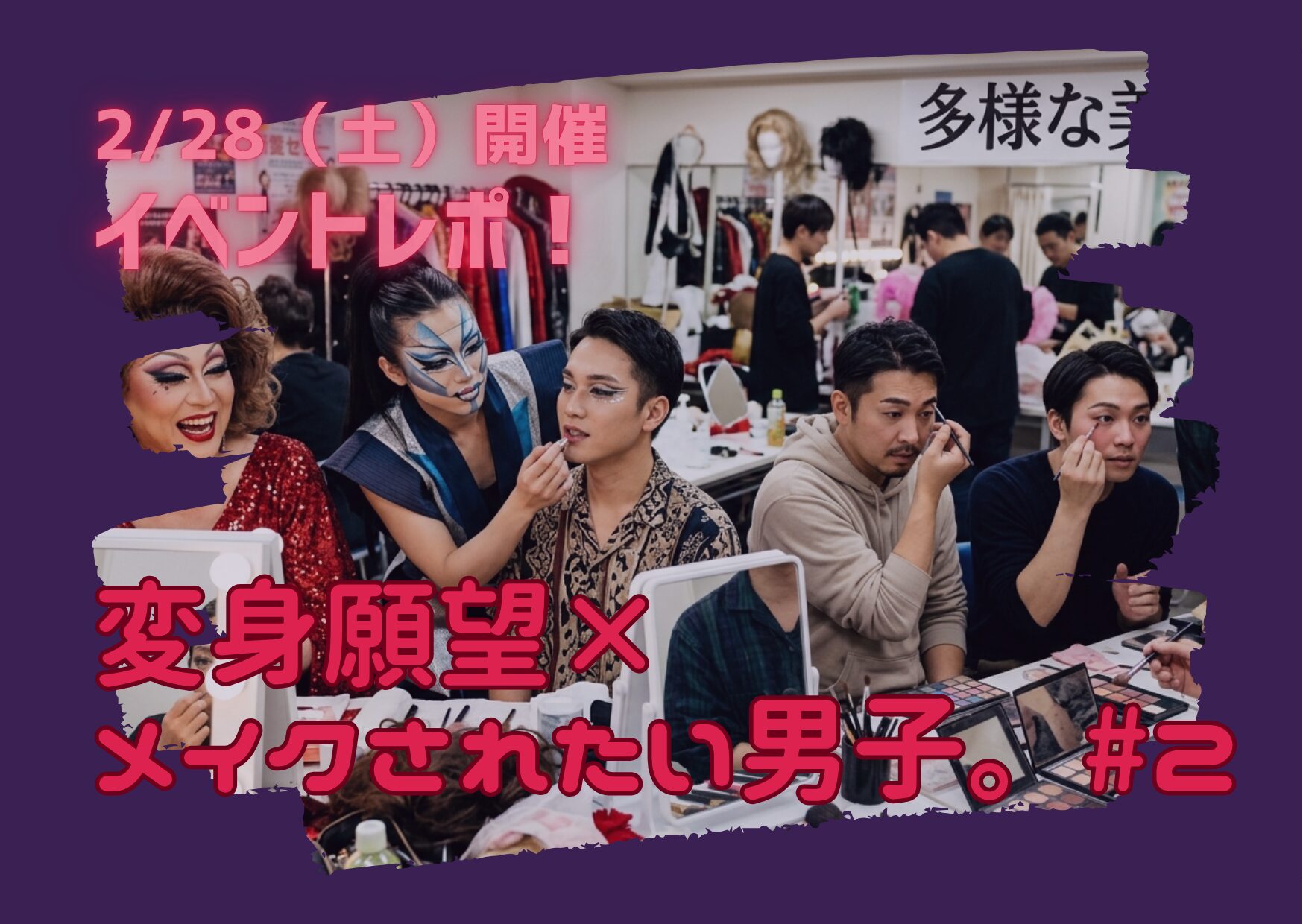 2/28に「変身願望×メイクされたい男子 #2」を開催しました。今回も初めてイベントに参加してくれた方がいて、とても嬉しかったです。メイクはスタッフのヨシジマシウさんと私の2名で担当し、会場は写真映えするかわいらしいスタジオを用意しました。ドラァグクイーンメイクのリクエストもあり、全体的に華やかで印象的な仕上がりに。時間にも余裕があったため、2パターン目のメイクに挑戦したり、ヨシジマシウさんのフェイスペイントを楽しんだりと、それぞれが思い思いに変身体験を満喫していました。