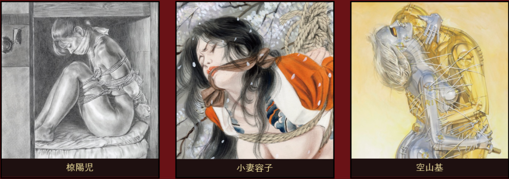 緊縛の表現における視覚の役割は高く、特に前述した先駆的な雑誌においてその圧倒的なイメージで読者を快楽へと誘ったのは、絵師たちが描く挿画でした。