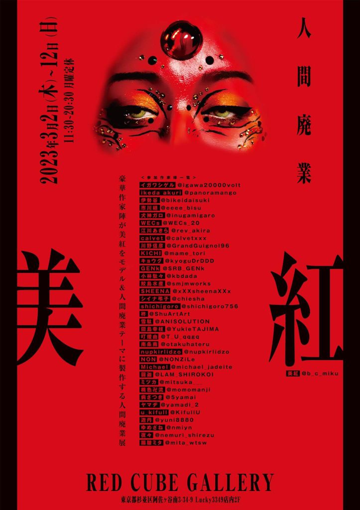2023年3月2日〜3月12日『人間廃業』展が開催中。会場は、阿佐ヶ谷の赤い美容室の2階にある真っ赤なアートギャラリーRED CUBE GALLERY (@redcubegallery_)です。
