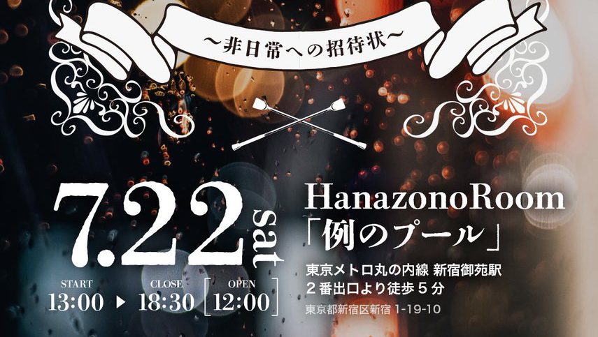 | 会場 | 例のプール/HanazonoRoom 東京都新宿区新宿1-19-10 <アクセス> 東京メトロ丸の内線「新宿御苑」駅2番出口より徒歩5分 |